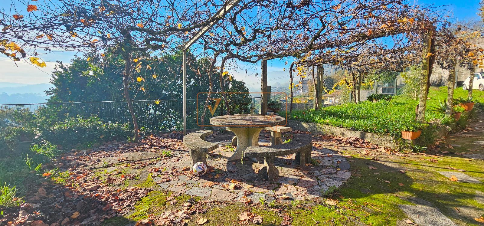 A todo esto se suma un garaje independiente, perfecto para el coche, herramientas o almacenamiento adicional; un patio muy agradable y una preciosa mesa de piedra bajo parras, uno de esos rincones que invitan a desayunar mirando el valle, a comer al aire libre o a pasar una tarde tranquila simplemente disfrutando del silencio y las vistas.