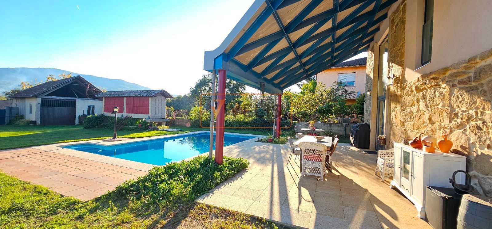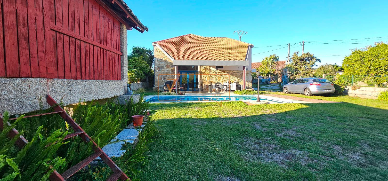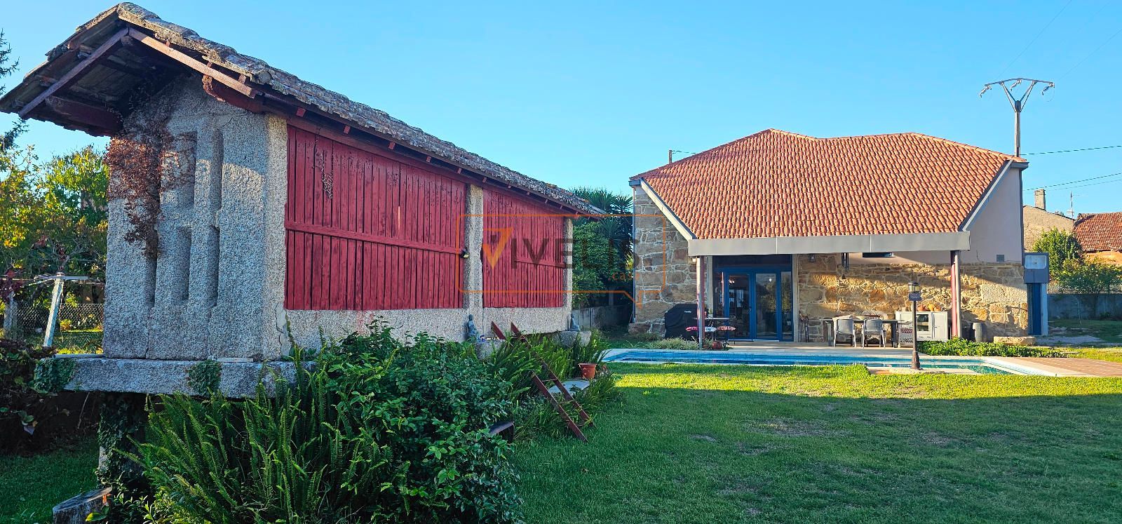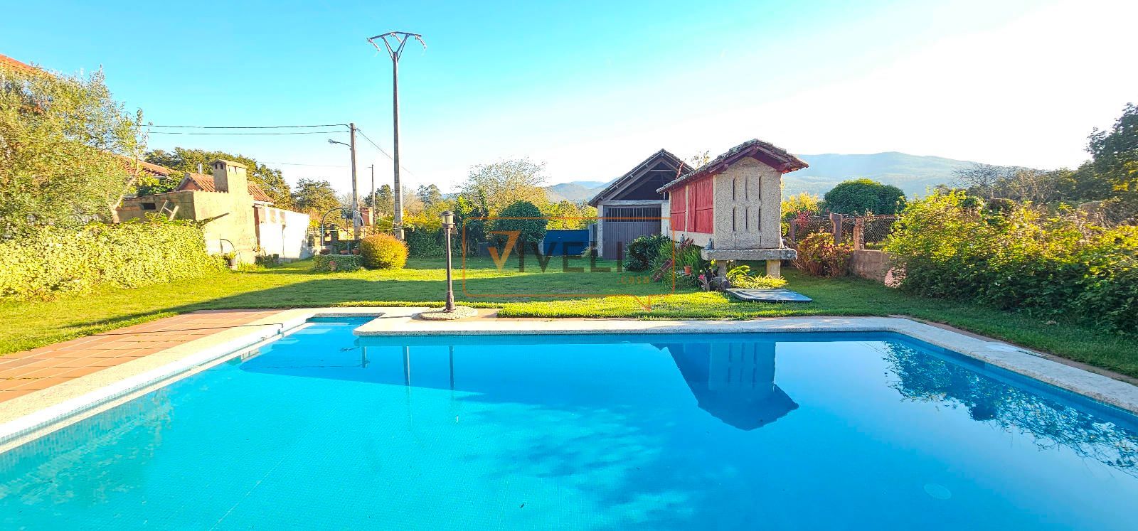 En el jardín principal, junto a la piscina, encontramos un pozo propio y dos auténticas joyas arquitectónicas: un hórreo gallego totalmente restaurado, que conserva todo su carácter tradicional, y un antiguo palleiro rehabilitado, hoy utilizado para guardar los aperos del jardín, pero con un enorme potencial para transformarse en un salón de verano, una cocina exterior o incluso un apartamento para invitados.