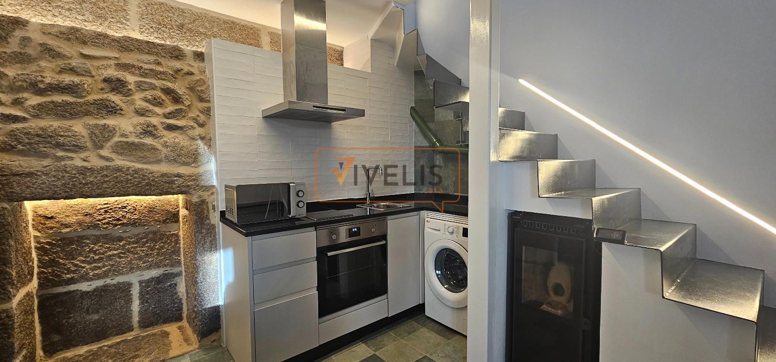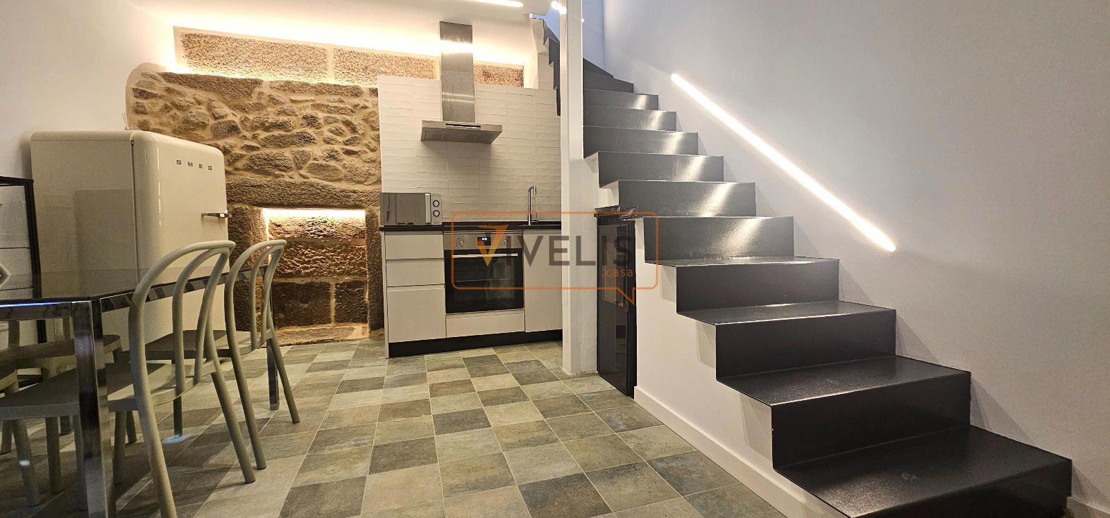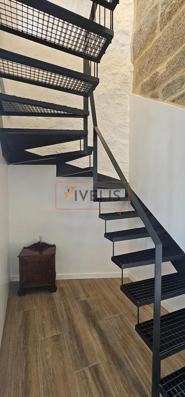 Destaca la cuidada reforma, donde la piedra vista se fusiona con elementos modernos como la escalera metálica, creando un ambiente actual sin perder el carácter histórico.