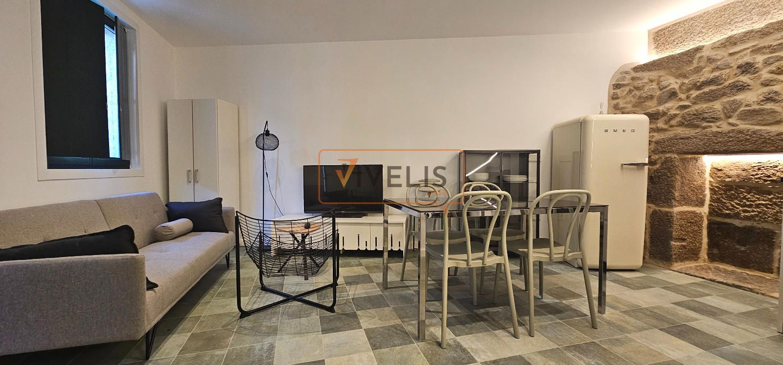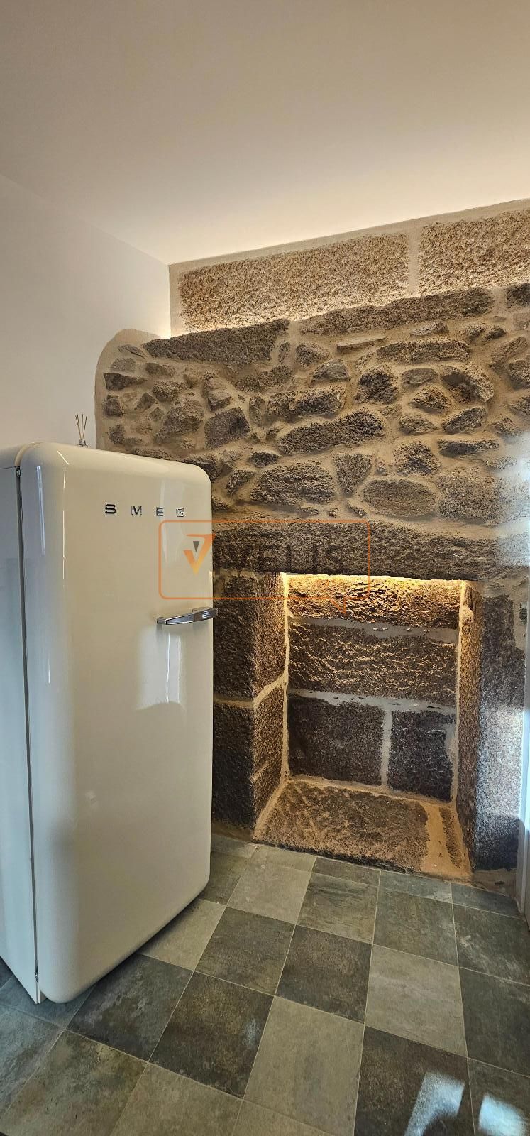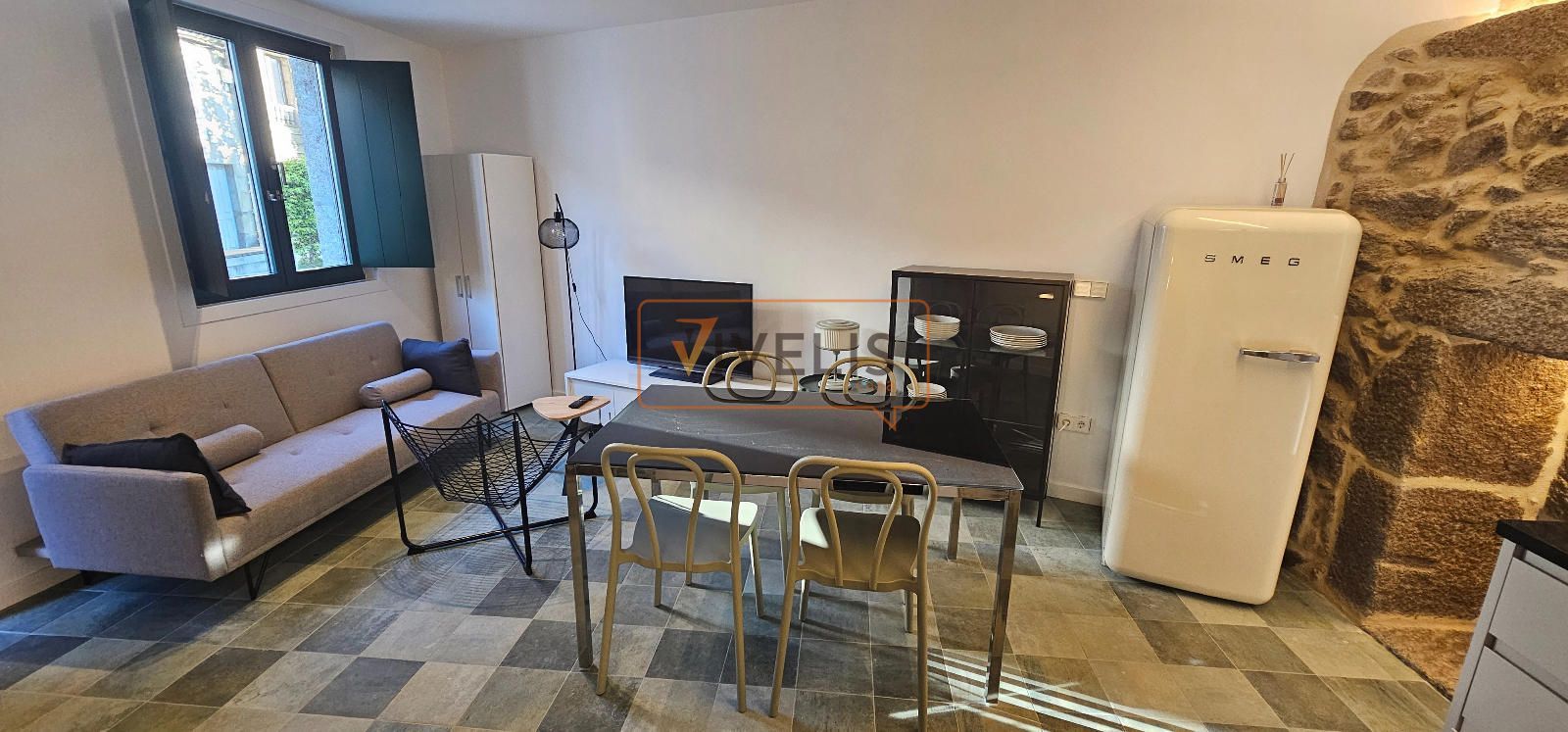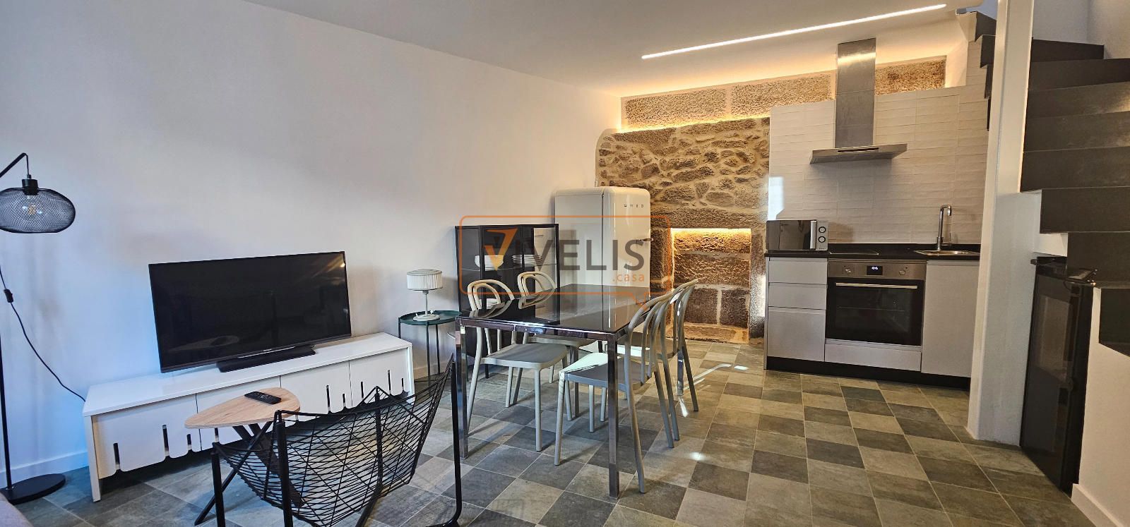 Destaca la cuidada reforma, donde la piedra vista se fusiona con elementos modernos como la escalera metálica, creando un ambiente actual sin perder el carácter histórico.