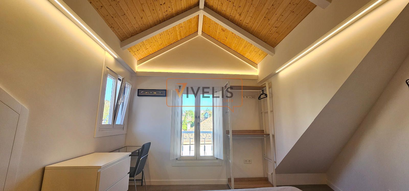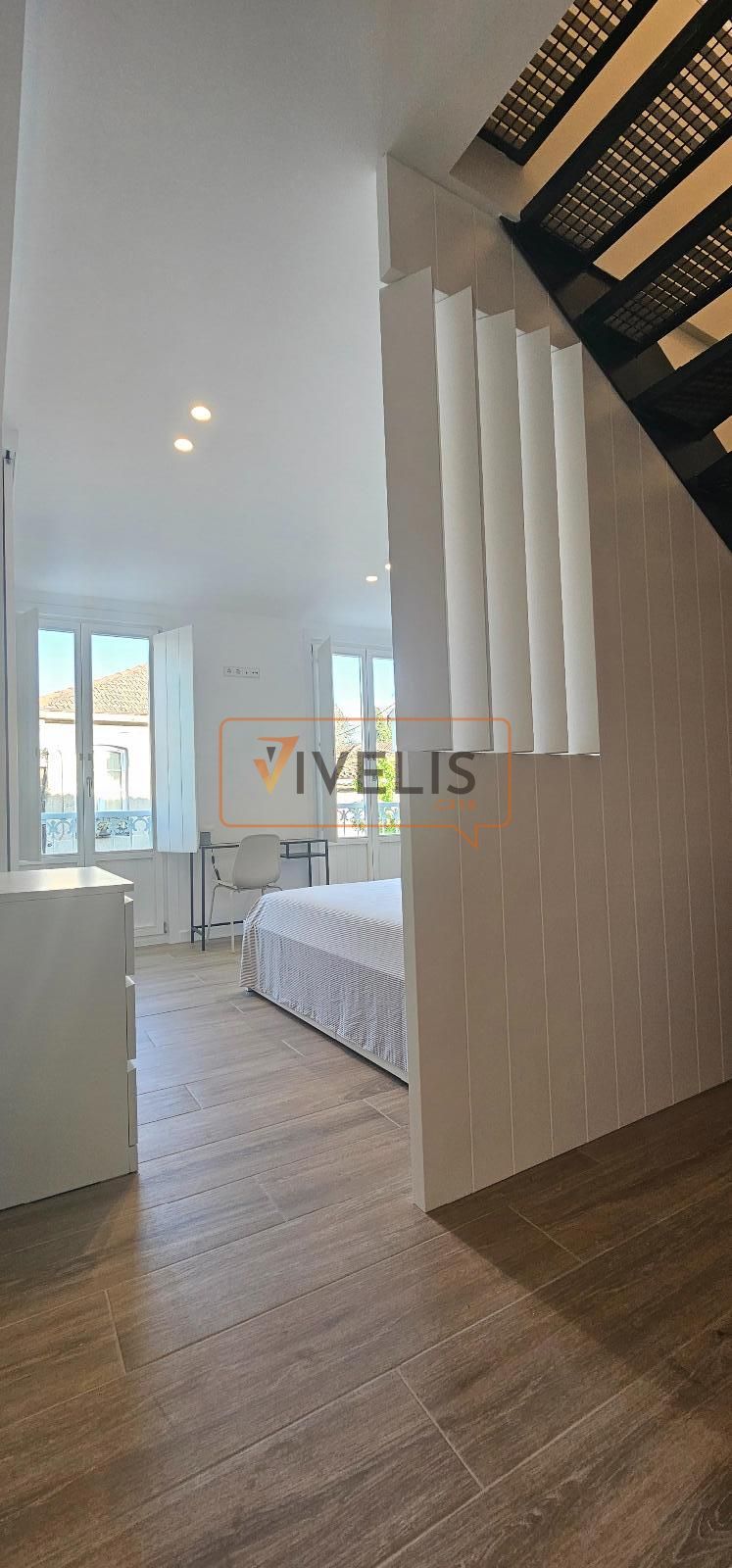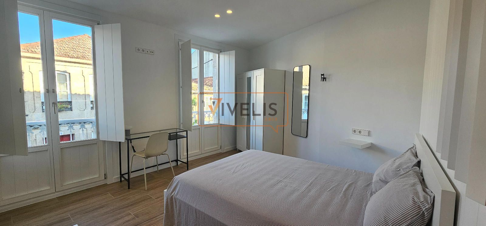 Primera planta: dormitorio principal con encanto, dos ventanales tipo balcón y un baño completo.