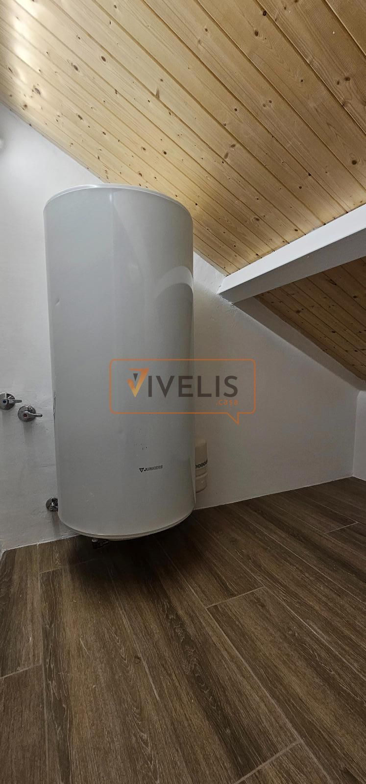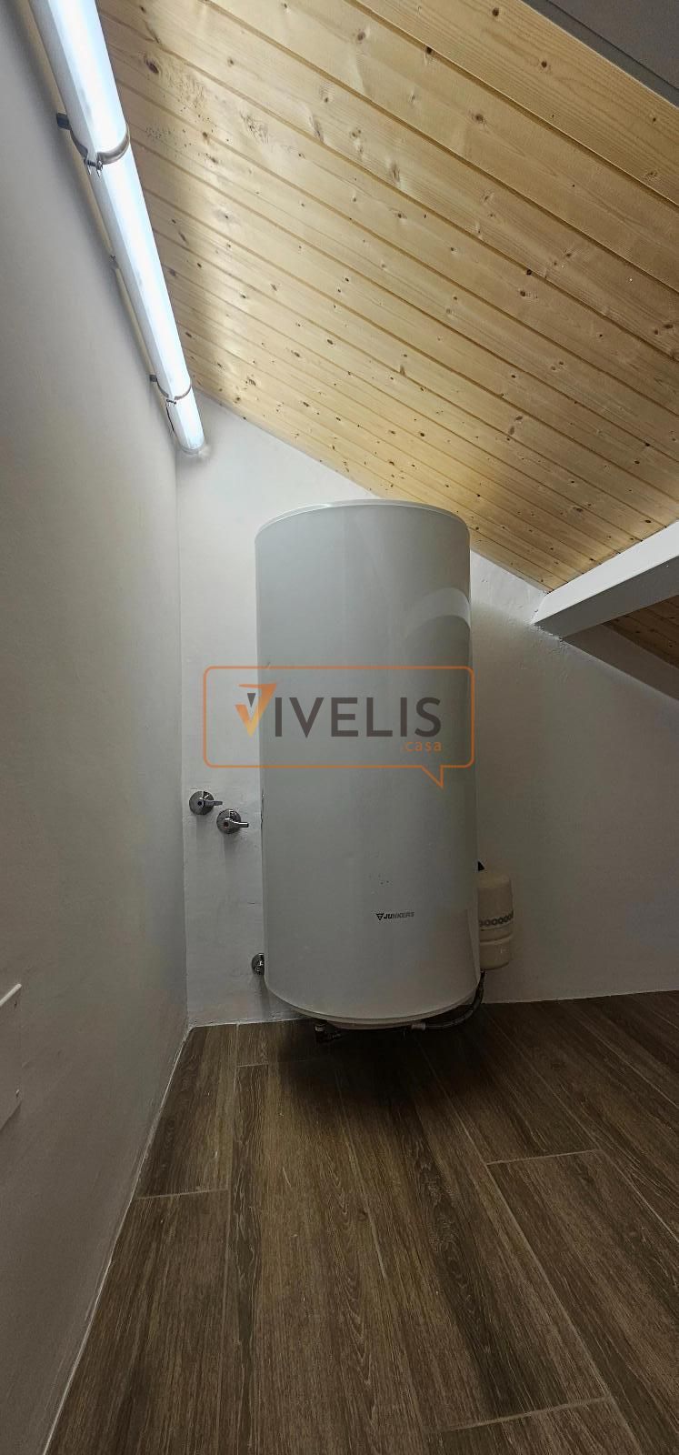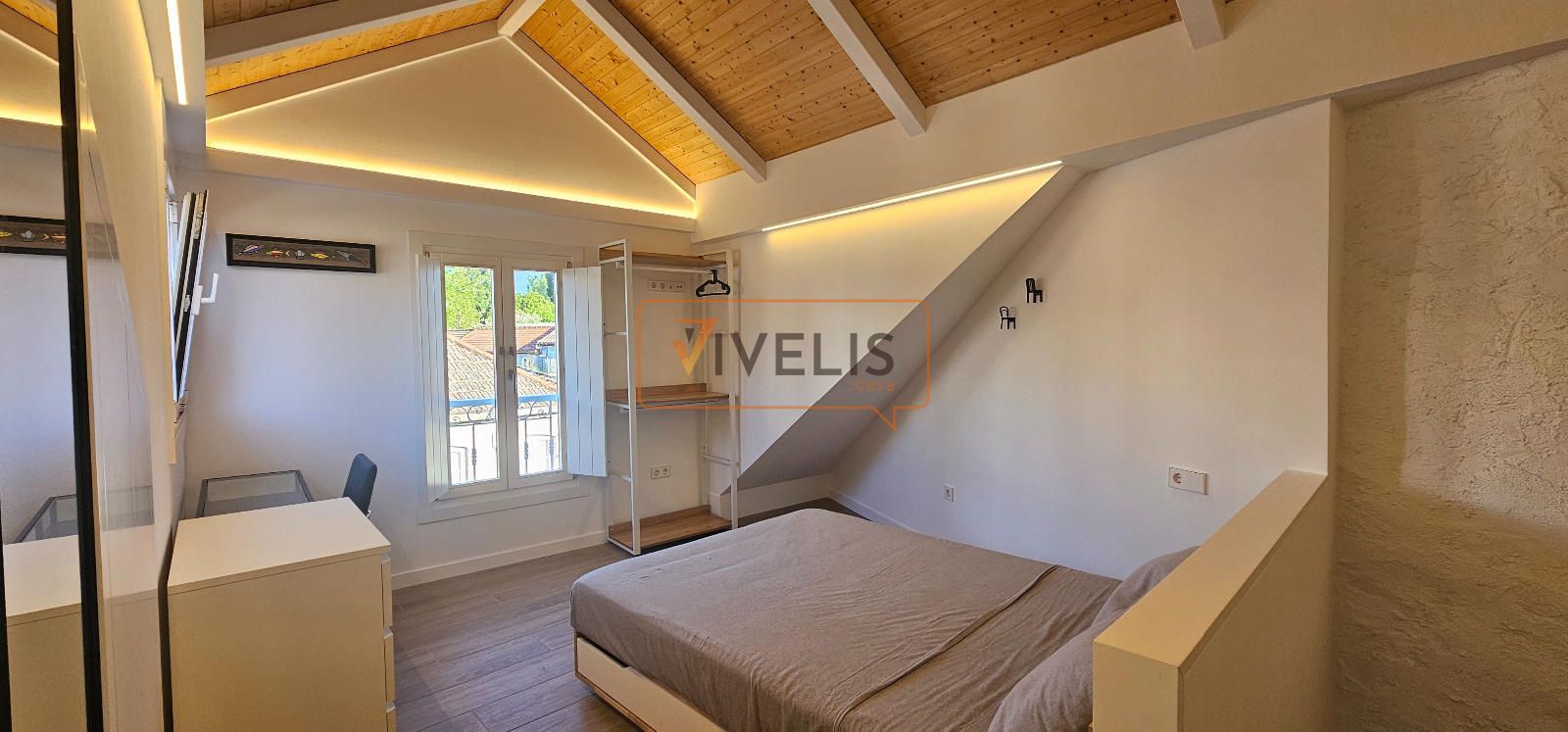 Planta superior: preciosa habitación abuhardillada con techos de madera, baño completo con luz natural (velux) y un práctico espacio de almacenaje donde se ubica el acumulador de agua caliente.
