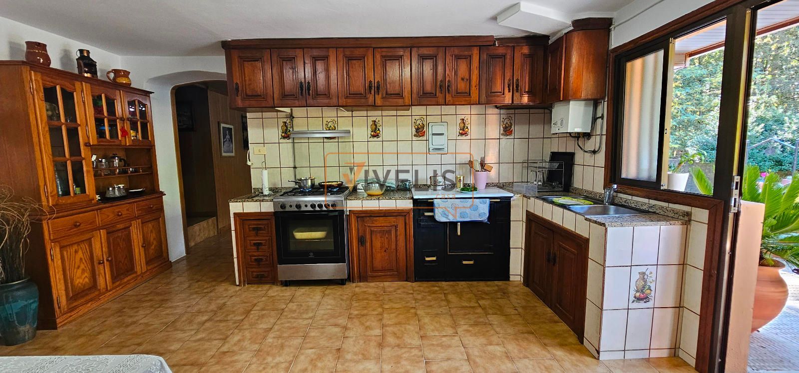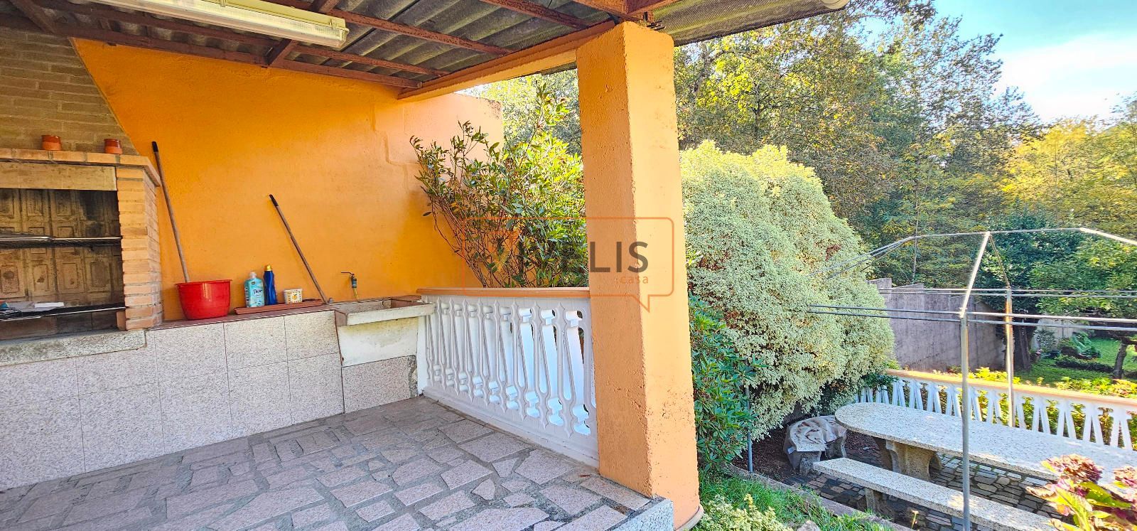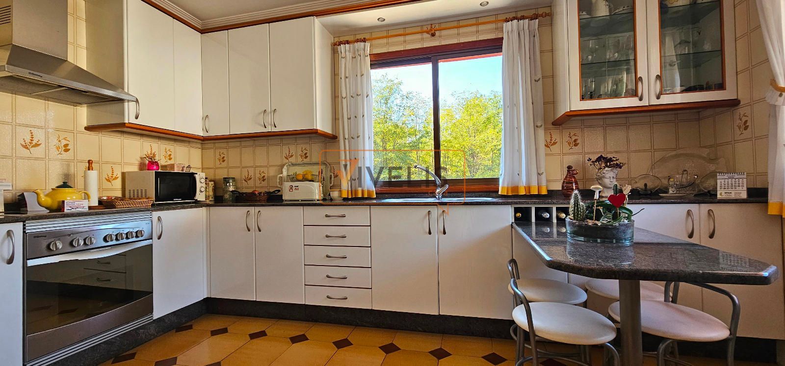 - En la planta alta, encontramos tres habitaciones, un baño, una cocina nueva, y un salón que se abre a una terraza increíble con vistas al verde. Todo rodeado por un balcón que te invita a respirar tranquilidad.